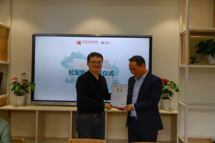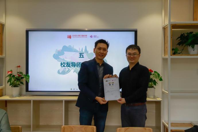 会议议程之校友导师聘任仪式。2019年年底学院聘请了首批48位优秀校友担任学院“校友导师”,共同参与人才培养过程,为在校生的“设计人生”和就业创业答疑解惑,此次为陈书新、陈奕两位优秀校友现场发放聘任证书。