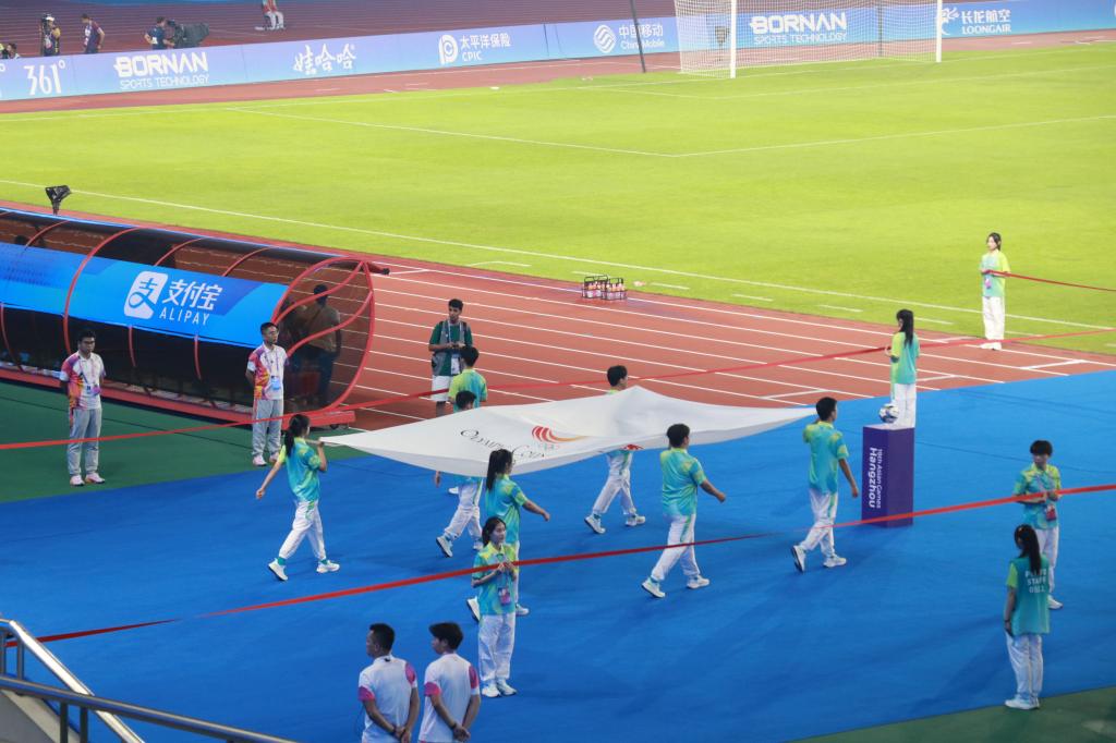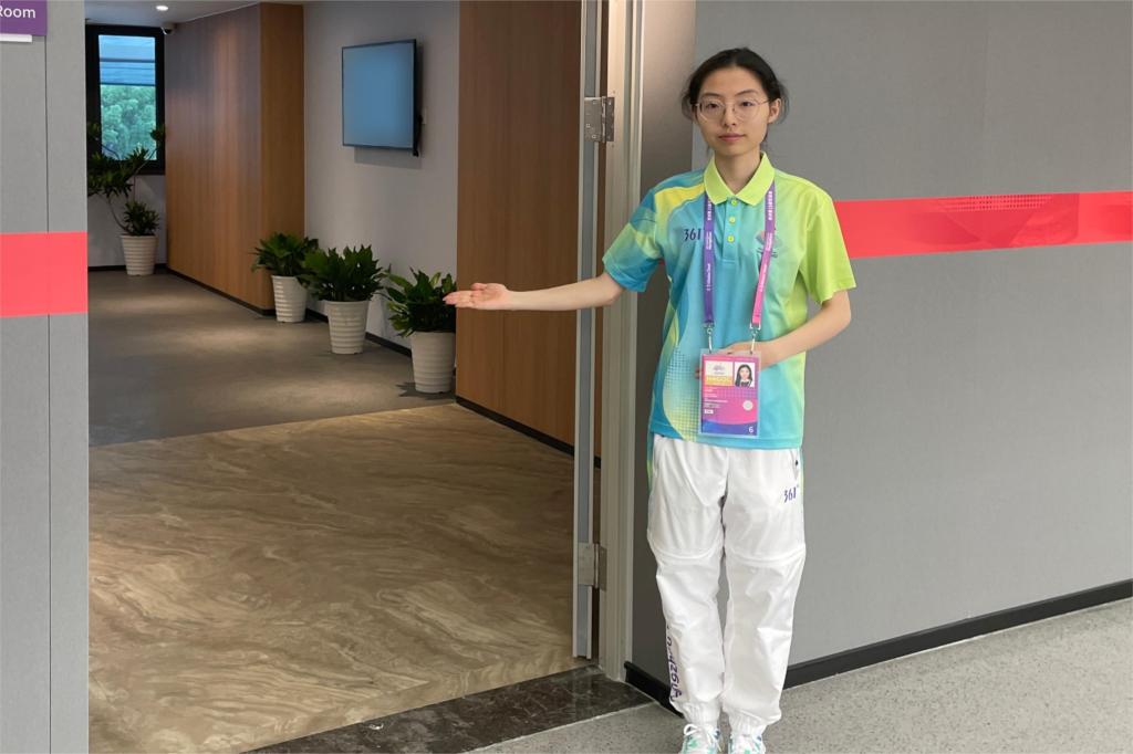 的58名“小青荷”身着青绿,在竞赛技术运行、礼宾接待、信息技术、观众服务等多个领域提供高质量的志愿服务,他们在奉献中展现亲和,用热情的微笑坚守岗位一线,书写亚运期间的青春篇章。默默坚守、暖心微笑、细致服务……第一次参与亚运会志愿服务工作,充满着未知。谈到亚运期间的场馆志愿服务经历,艺术学院服工211危盈霏激动地说:“有机会成为亚运会的赛会志愿者对我来说意义非凡。从一开始的有些手足无措,到后来通过我们的服务确保场馆礼宾区能够顺利运行。当听到大家对于我们志愿者工作的认可和赞扬时,我感觉所有的付出都是值得的。