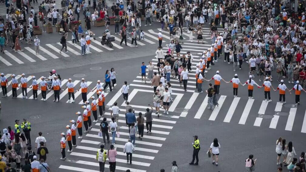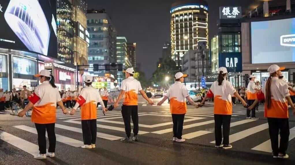 的志愿者们在上城区湖滨街道坚守岗位,每天从下午三点工作至晚间八点,每次当路口绿灯亮起,“人墙”自动裂开,身后的人潮蜂拥而出,涌向马路的另一边;红灯亮起,“人墙”再次合拢。在这样的循环往复中,由青年志愿者组成的“人墙”如蝴蝶飞舞般开开合合,保证行人和车辆都能遵守交通秩序,让人们看到了杭州青年志愿者的温度和美好。